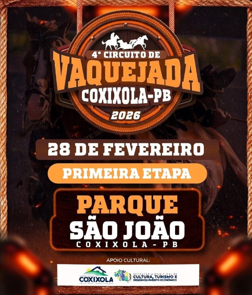 O Parque São João já se prepara para as batidas de sela e as derrubadas dos bois na faixa. No próximo dia 28 de fevereiro, Coxixola dá o pontapé inicial no aguardado Circuito de Vaquejada 2026, marcando a primeira etapa de uma programação que promete reunir vaqueiros, famílias e apaixonados pelo esporte de toda a região, consolidando o município como um dos principais polos dessa tradição no Cariri.