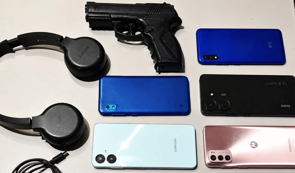 Durante a abordagem, os policiais recuperaram sete aparelhos celulares roubados e apreenderam um simulacro de arma de fogo, objeto que teria sido usado para ameaçar e intimidar as vítimas durante os assaltos.