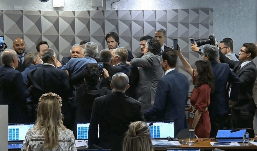 A sessão da CPMI do INSS terminou em confusão, empurra-empurra e troca de acusações após a aprovação de requerimentos por 14 votos a 7. Parlamentares governistas protestaram contra o resultado da votação simbólica, realizada por contraste visual, o que gerou tumulto no plenário. Houve registro de socos, e deputados precisaram ser separados.