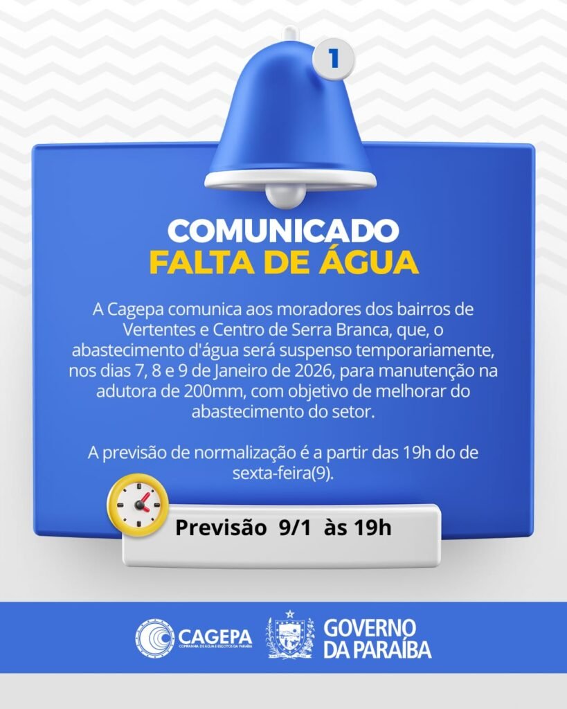 A Companhia de Água e Esgotos da Paraíba (Cagepa) informou que o abastecimento de água nos bairros Vertentes e Centro, em Serra Branca, está temporariamente suspenso a partir de hoje (quarta-feira). A interrupção é necessária para a realização de uma obra de grande porte na rede de distribuição local.