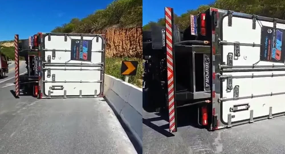 O veículo transportava carga de hortifruti de uma rede de supermercados e ficou fora da pista de rodagem após o motorista perder o controle da direção e tombar o veículo. De acordo com a Polícia Rodoviária Federal (PRF), ninguém ficou ferido após o acidente.