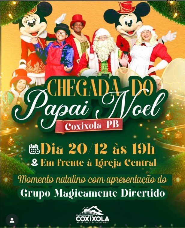 A magia do Natal vai tomar conta de Coxixola neste sábado (20), a partir das 19h, com um evento especial preparado pela Prefeitura Municipal para celebrar a chegada do Papai Noel. A ação promete encantar moradores de todas as idades e marcar o clima de confraternização que toma conta da cidade neste fim de ano.