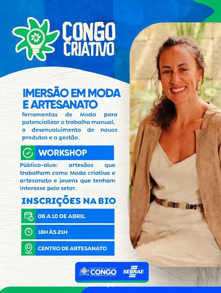 O Centro de Artesanato será palco, entre os dias 6 e 10 de abril de 2026, de uma imersão em moda e artesanato que promete movimentar o cenário criativo local. A programação acontece sempre das 18h às 21h e integra as ações do projeto “Congo Tá na Moda”, iniciativa que valoriza a identidade cultural e impulsiona o talento da região.