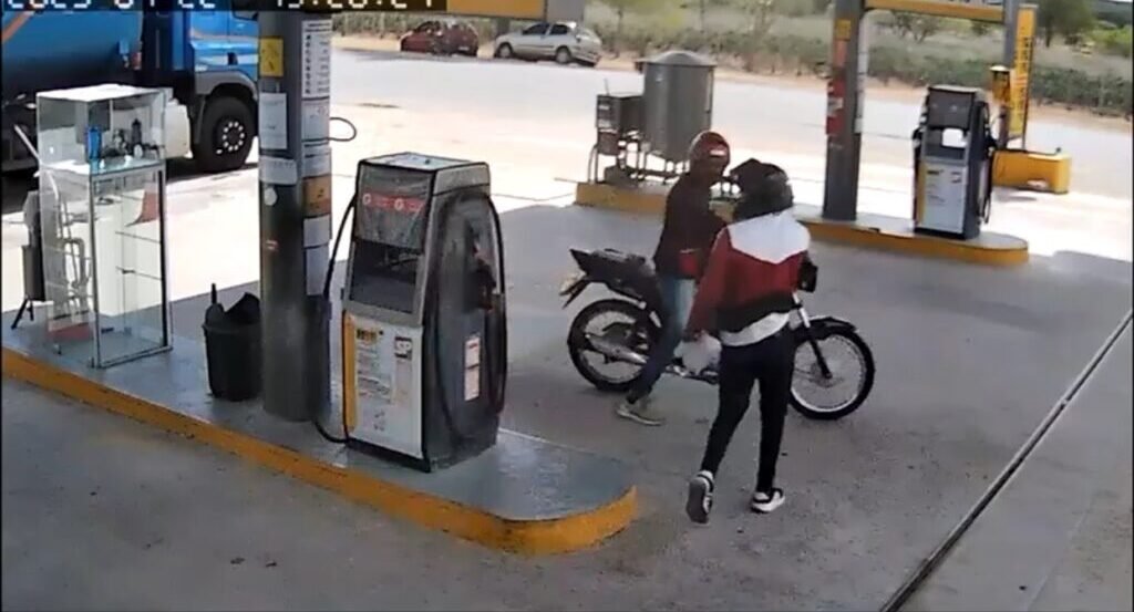 Imagens do circuito interno de segurança do estabelecimento registraram o momento em que dois indivíduos armados chegaram ao local em uma motocicleta. Ambos utilizavam capacetes e anunciaram o assalto a um dos frentistas que trabalhava no momento.