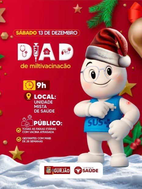 A Prefeitura de Gurjão, por meio da Secretaria Municipal de Saúde, realiza neste sábado, 13 de dezembro, o Dia D de Multivacinação, uma ação destinada a ampliar a cobertura vacinal no município. A mobilização acontece a partir das 9h, na Unidade Mista de Saúde.