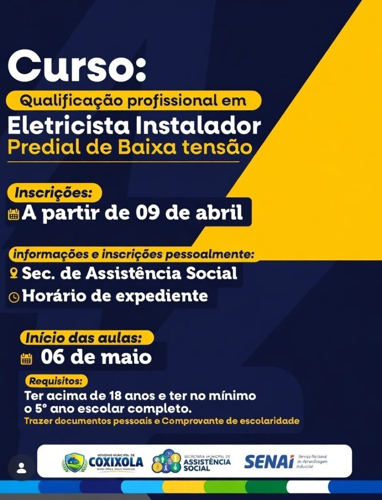 A Prefeitura de Coxixola, por meio da Secretaria de Assistência Social, abriu inscrições para o curso de Eletricista Instalador Predial de Baixa Tensão, ampliando as oportunidades de qualificação profissional no município.