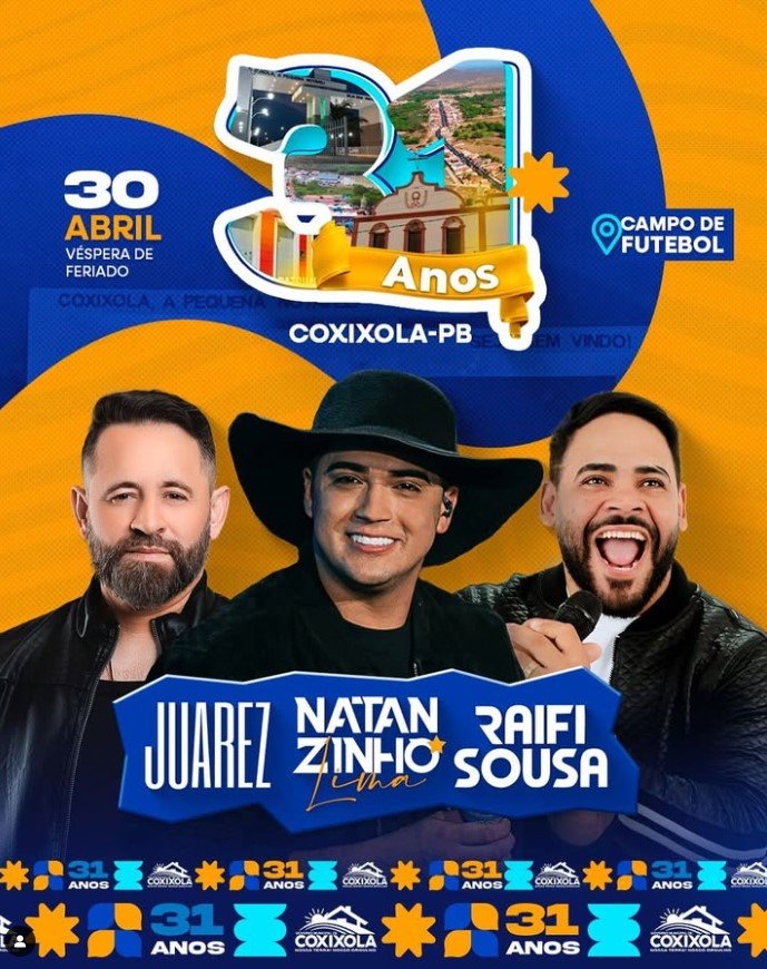 A grade de atrações promete agitar a noite e reunir um grande público. Entre os destaques está o fenômeno Natanzinho Lima, um dos nomes mais queridos do momento, que traz para o palco de Coxixola um repertório repleto de sucessos. O evento também contará com o show do cantor Juarez, conhecido por sua voz marcante no forró e pelo sucesso crescente em sua carreira solo.