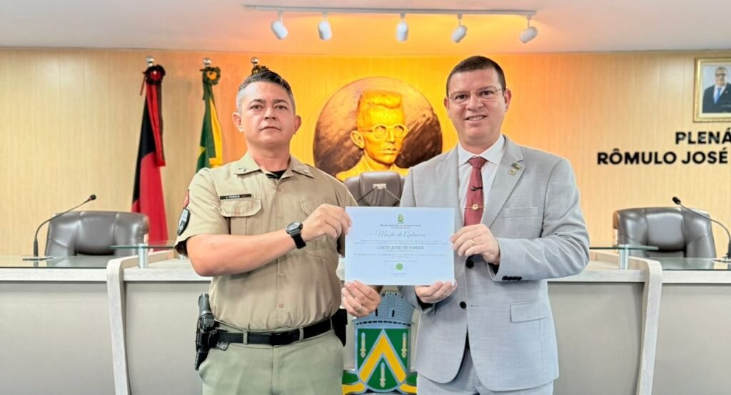 A Câmara Municipal de Campina Grande homenageou, pela segunda vez, o sargento Lúcio José de Farias (J. Farias), policial militar natural de Gurjão (PB), em reconhecimento à excelência dos serviços prestados à população. A Moção de Aplausos foi proposta pelo vereador Dinho Papaléguas, que destacou o profissionalismo e o compromisso do militar ao longo de sua carreira.