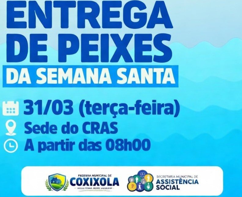 A Prefeitura de Coxixola, por meio da Secretaria Municipal de Assistência Social, promove nesta terça-feira (31) a tradicional entrega de peixes da Semana Santa para a população.